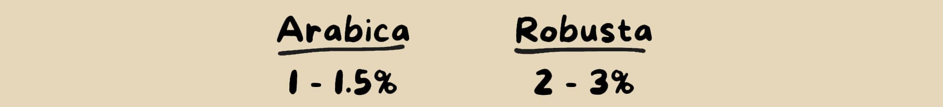 Arabica har en koffeinhalt på 1-1.5% och Robusta har en högre på 2-3%.