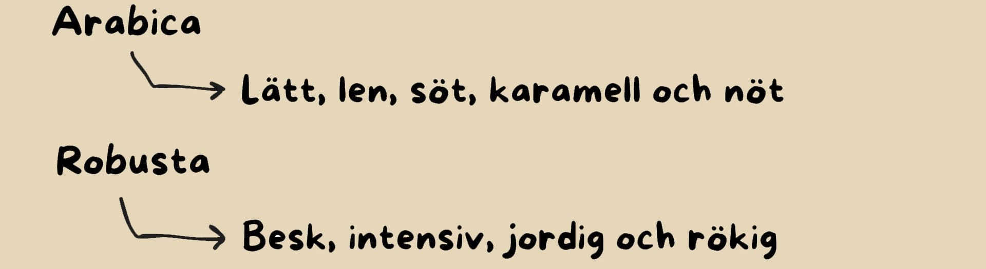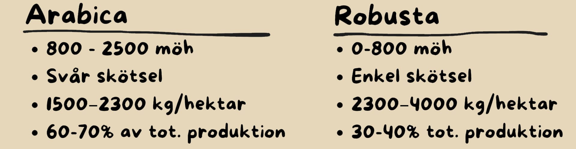 Med mer än 120 st kaffetyper i världen så finns det bara två som tar upp mer än 95% av kaffeproduktionen: Arabica och Robusta. Dessa två har i sin tur hundratals av variationer och unika smaker.