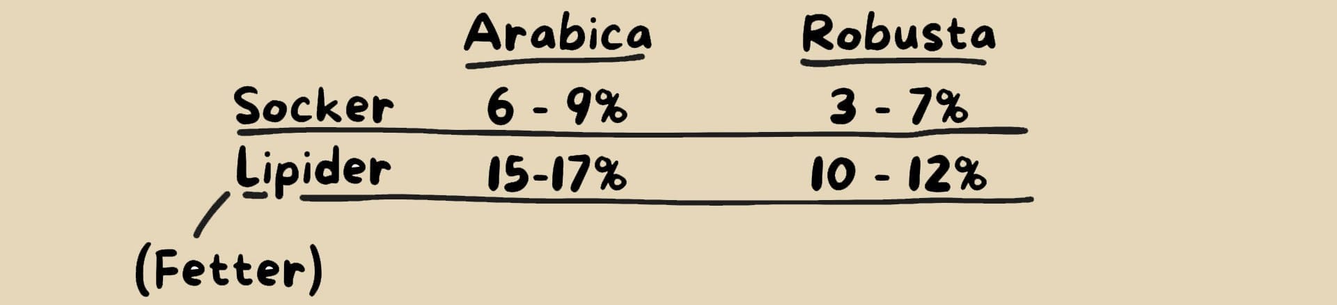 Arabica 60% mer lipider och dubbelt så mycket socker än Robusta. Detta är en av de största faktorerna till varför Arabicas smak föredras mer än Robusta.